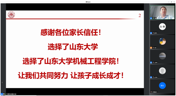 朱洪涛对专业选择和专业学习做了详细的讲解,希望家长和新生正确理解专业,提升对专业的认识,在新的环境中继续砥砺前行;增强主动学习能力,成为专业过硬的全面发展的青年人才。学院团委书记王忠山向家长们介绍了学生活动和事务管理等内容,帮助家长了解孩子们的大学生活。新生辅导员翟一鸣、隋仲阳介绍了年级工作,提醒开学报到时的注意事项。在家校互动环节中,学院与会领导详细回答了学生家长关于专业培养和教育管理等方面的具体问题,与家长进行了充分的沟通交流。会议最后由学校心理中心孙浩令老师进一步与家长交流关于学生心理的相关内容,强调了心理健康、家校互动的重要性。