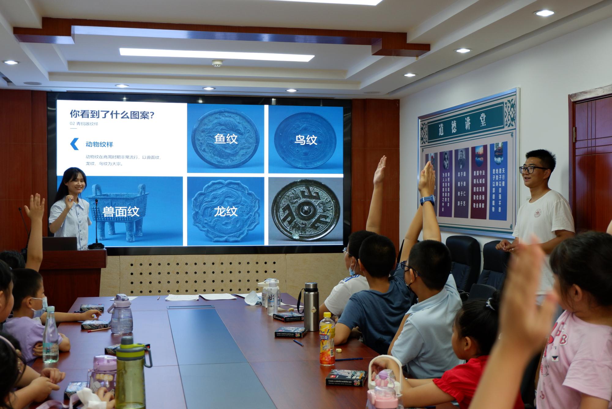 随后,周航宇通过市博馆藏文物资料向同学们介绍纹样纹饰,引领孩子们观察青铜器上形色各异的动物造型,包括兽面纹、鸟纹、鱼纹、龙纹、鹿纹等,并依次解读了它们在器物中的运用及文化内涵。孩子们积极举手,踊跃发言,分享各自在文物表面的发现。团队循循善诱的教学方式让孩子们的思维得到发散,加深孩子们对传统文化内涵的理解。